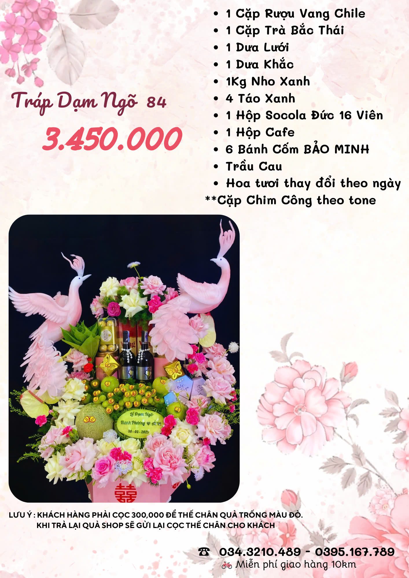 tráp dạm ngõ 84  : 3.450.000 vnd (  1 trái dưa lưới + 1 trái dưa khắc+ 1 kg nho xanh + 4 trái táo xanh +1 cặp vang chile +1 căp trà olong + 7 cốm bảo minh +1 hộp socola đức + 1 cặp chim công + 10 trầu cau + kết bông 2 tụ ) LƯU Ý : KHÁCH HÀNG PHẢI CỌC 300,000 ĐỂ THẾ CHÂN QUẢ TRỐNG  . KHI TRẢ LẠI QUẢ SHOP SẼ GỬI LẠI CỌC THẾ CHÂN CHO KHÁCH +MIỄN PHÍ SHIP 10KM